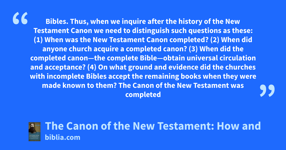 Bibles. Thus, when we inquire after the history of the New Testament Canon we need to distinguish such questions as these: (1) When was the New Testament Canon completed? (2) When did anyone church acquire a completed canon? (3) When did the completed canon—the complete Bible—obtain universal circulation and acceptance? (4) On what ground and evidence did the churches with incomplete Bibles accept the remaining books when they were made known to them? The Canon of the New Testament was completed