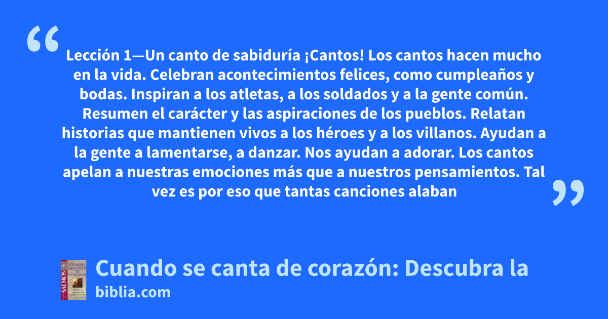 Lección 1—Un canto de sabiduría ¡Cantos! Los cantos hacen mucho en la vida. Celebran acontecimientos felices, como cumpleaños y bodas. Inspiran a los atletas, a los soldados y a la gente común. Resumen el carácter y las aspiraciones de los pueblos. Relatan historias que mantienen vivos a los héroes y a los villanos. Ayudan a la gente a lamentarse, a danzar. Nos ayudan a adorar. Los cantos apelan a nuestras emociones más que a nuestros pensamientos. Tal vez es por eso que tantas canciones alaban