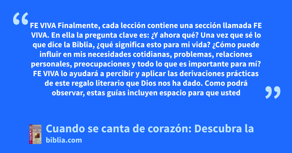 FE VIVA Finalmente, cada lección contiene una sección llamada FE VIVA. En ella la pregunta clave es: ¿Y ahora qué? Una vez que sé lo que dice la Biblia, ¿qué significa esto para mi vida? ¿Cómo puede influir en mis necesidades cotidianas, problemas, relaciones personales, preocupaciones y todo lo que es importante para mí? FE VIVA lo ayudará a percibir y aplicar las derivaciones prácticas de este regalo literario que Dios nos ha dado. Como podrá observar, estas guías incluyen espacio para que usted