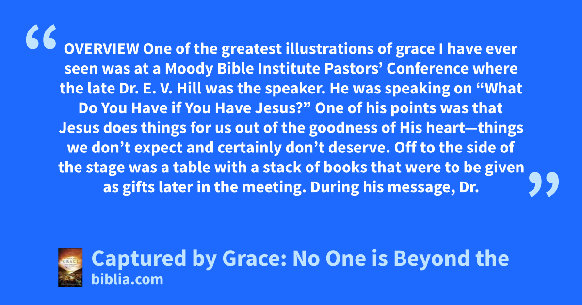 OVERVIEW One of the greatest illustrations of grace I have ever seen was at a Moody Bible Institute Pastors’ Conference where the late Dr. E. V. Hill was the speaker. He was speaking on “What Do You Have if You Have Jesus?” One of his points was that Jesus does things for us out of the goodness of His heart—things we don’t expect and certainly don’t deserve. Off to the side of the stage was a table with a stack of books that were to be given as gifts later in the meeting. During his message, Dr.