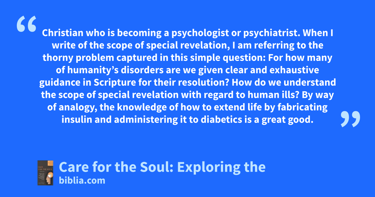 Christian who is becoming a psychologist or psychiatrist. When I write of the scope of special revelation, I am referring to the thorny problem captured in this simple question: For how many of humanity’s disorders are we given clear and exhaustive guidance in Scripture for their resolution? How do we understand the scope of special revelation with regard to human ills? By way of analogy, the knowledge of how to extend life by fabricating insulin and administering it to diabetics is a great good.