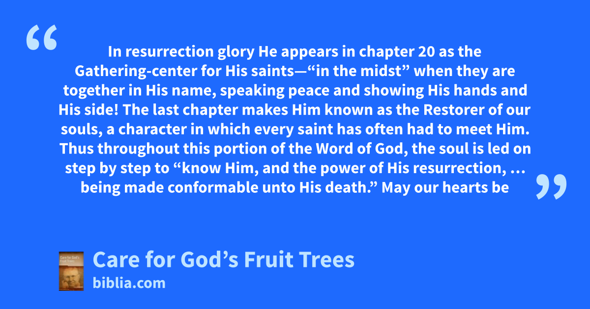 In resurrection glory He appears in chapter 20 as the Gathering-center for His saints—“in the midst” when they are together in His name, speaking peace and showing His hands and His side! The last chapter makes Him known as the Restorer of our souls, a character in which every saint has often had to meet Him. Thus throughout this portion of the Word of God, the soul is led on step by step to “know Him, and the power of His resurrection, … being made conformable unto His death.” May our hearts be