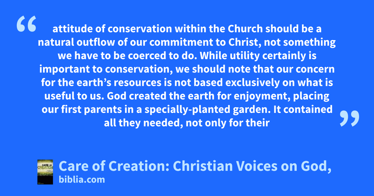 attitude of conservation within the Church should be a natural outflow of our commitment to Christ, not something we have to be coerced to do. While utility certainly is important to conservation, we should note that our concern for the earth’s resources is not based exclusively on what is useful to us. God created the earth for enjoyment, placing our first parents in a specially-planted garden. It contained all they needed, not only for their