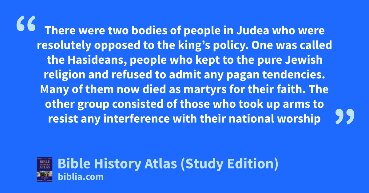 There were two bodies of people in Judea who were resolutely opposed to the king’s policy. One was called the Hasideans, people who kept to the pure Jewish religion and refused to admit any pagan tendencies. Many of them now died as martyrs for their faith. The other group consisted of those who took up arms to resist any interference with their national worship