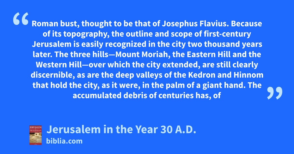 Roman bust, thought to be that of Josephus Flavius. Because of its topography, the outline and scope of first-century Jerusalem is easily recognized in the city two thousand years later. The three hills—Mount Moriah, the Eastern Hill and the Western Hill—over which the city extended, are still clearly discernible, as are the deep valleys of the Kedron and Hinnom that hold the city, as it were, in the palm of a giant hand. The accumulated debris of centuries has, of