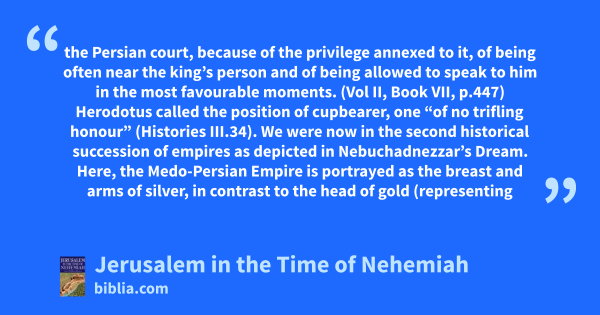 the Persian court, because of the privilege annexed to it, of being often near the king’s person and of being allowed to speak to him in the most favourable moments. (Vol II, Book VII, p.447) Herodotus called the position of cupbearer, one “of no trifling honour” (Histories III.34). We were now in the second historical succession of empires as depicted in Nebuchadnezzar’s Dream. Here, the Medo-Persian Empire is portrayed as the breast and arms of silver, in contrast to the head of gold (representing