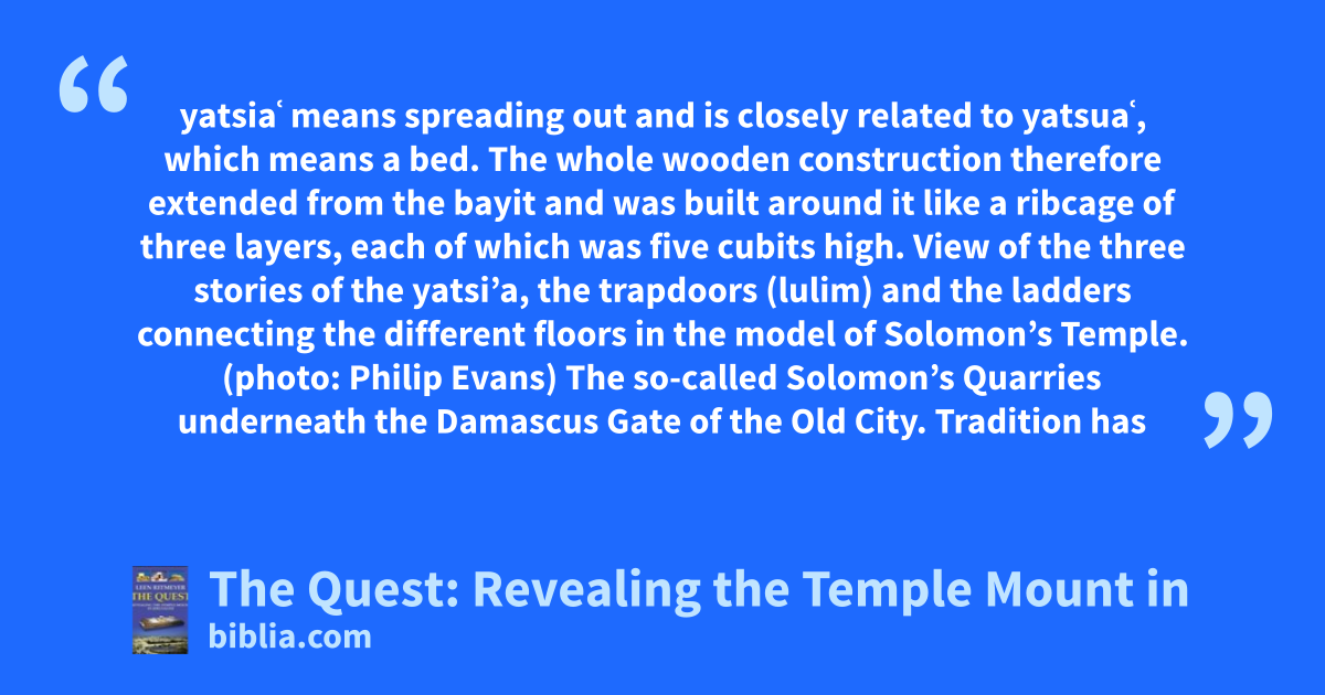 yatsiaʿ means spreading out and is closely related to yatsuaʿ, which means a bed. The whole wooden construction therefore extended from the bayit and was built around it like a ribcage of three layers, each of which was five cubits high. View of the three stories of the yatsi’a, the trapdoors (lulim) and the ladders connecting the different floors in the model of Solomon’s Temple. (photo: Philip Evans) The so-called Solomon’s Quarries underneath the Damascus Gate of the Old City. Tradition has
