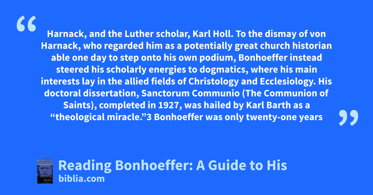 Harnack, and the Luther scholar, Karl Holl. To the dismay of von Harnack, who regarded him as a potentially great church historian able one day to step onto his own podium, Bonhoeffer instead steered his scholarly energies to dogmatics, where his main interests lay in the allied fields of Christology and Ecclesiology. His doctoral dissertation, Sanctorum Communio (The Communion of Saints), completed in 1927, was hailed by Karl Barth as a “theological miracle.”3 Bonhoeffer was only twenty-one years