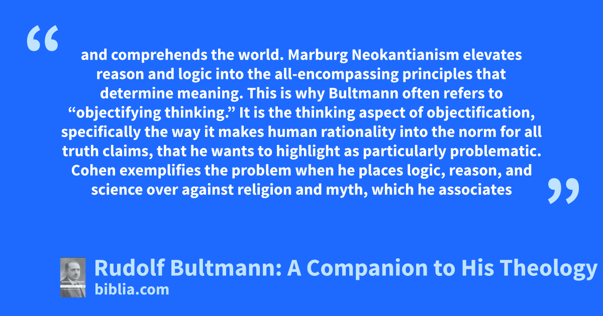 and comprehends the world. Marburg Neokantianism elevates reason and logic into the all-encompassing principles that determine meaning. This is why Bultmann often refers to “objectifying thinking.” It is the thinking aspect of objectification, specifically the way it makes human rationality into the norm for all truth claims, that he wants to highlight as particularly problematic. Cohen exemplifies the problem when he places logic, reason, and science over against religion and myth, which he associates