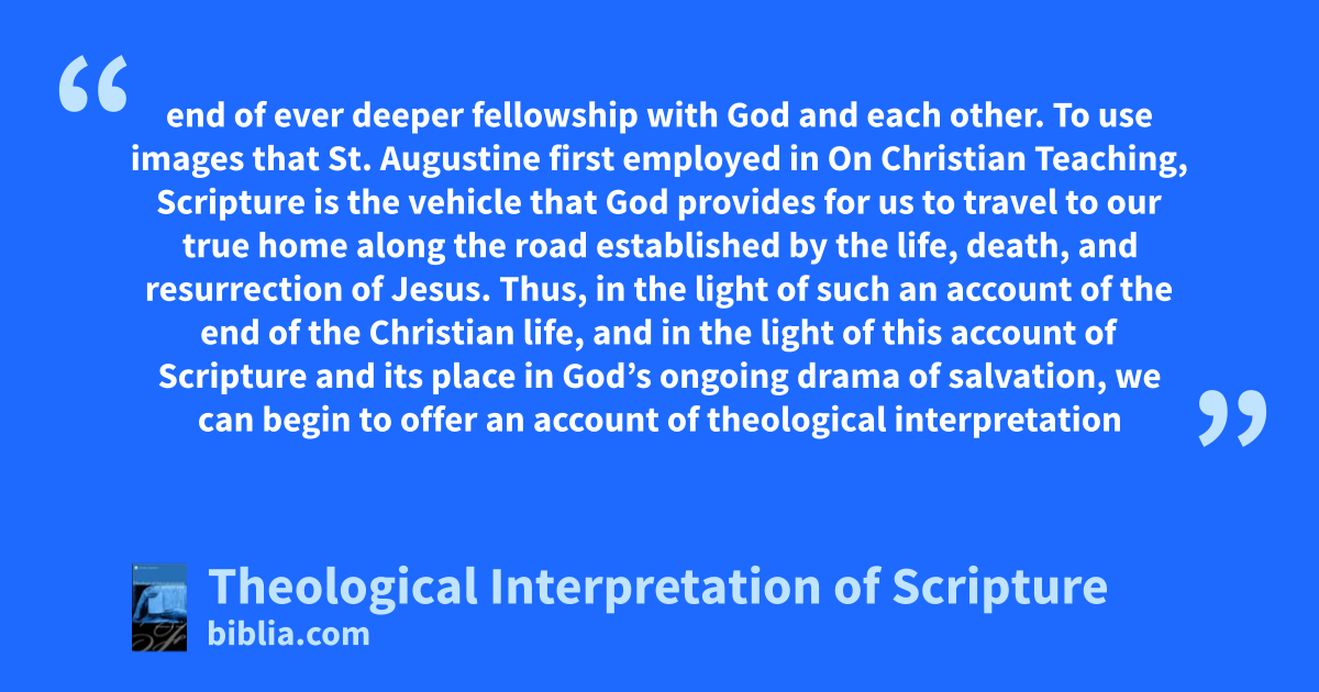 end of ever deeper fellowship with God and each other. To use images that St. Augustine first employed in On Christian Teaching, Scripture is the vehicle that God provides for us to travel to our true home along the road established by the life, death, and resurrection of Jesus. Thus, in the light of such an account of the end of the Christian life, and in the light of this account of Scripture and its place in God’s ongoing drama of salvation, we can begin to offer an account of theological interpretation