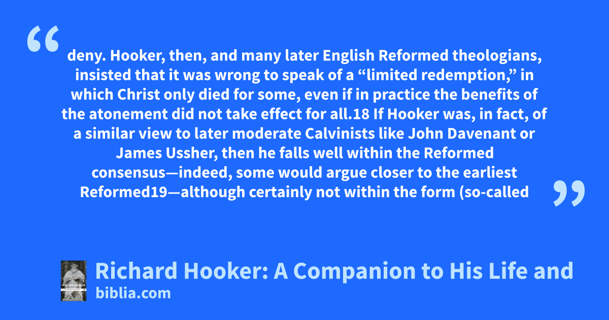 deny. Hooker, then, and many later English Reformed theologians, insisted that it was wrong to speak of a “limited redemption,” in which Christ only died for some, even if in practice the benefits of the atonement did not take effect for all.18 If Hooker was, in fact, of a similar view to later moderate Calvinists like John Davenant or James Ussher, then he falls well within the Reformed consensus—indeed, some would argue closer to the earliest Reformed19—although certainly not within the form (so-called
