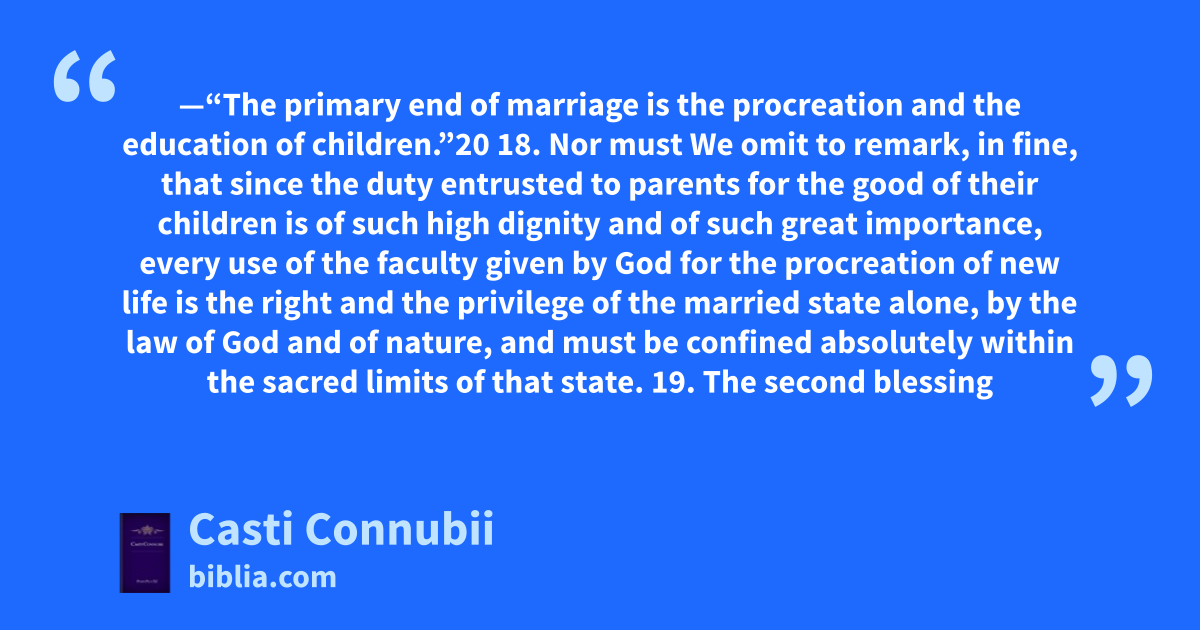 —“The primary end of marriage is the procreation and the education of children.”20 18. Nor must We omit to remark, in fine, that since the duty entrusted to parents for the good of their children is of such high dignity and of such great importance, every use of the faculty given by God for the procreation of new life is the right and the privilege of the married state alone, by the law of God and of nature, and must be confined absolutely within the sacred limits of that state. 19. The second blessing