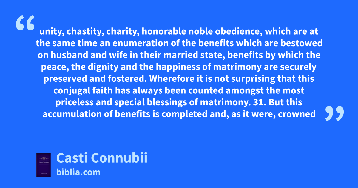 unity, chastity, charity, honorable noble obedience, which are at the same time an enumeration of the benefits which are bestowed on husband and wife in their married state, benefits by which the peace, the dignity and the happiness of matrimony are securely preserved and fostered. Wherefore it is not surprising that this conjugal faith has always been counted amongst the most priceless and special blessings of matrimony. 31. But this accumulation of benefits is completed and, as it were, crowned