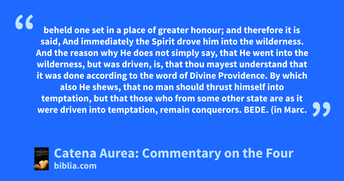 beheld one set in a place of greater honour; and therefore it is said, And immediately the Spirit drove him into the wilderness. And the reason why He does not simply say, that He went into the wilderness, but was driven, is, that thou mayest understand that it was done according to the word of Divine Providence. By which also He shews, that no man should thrust himself into temptation, but that those who from some other state are as it were driven into temptation, remain conquerors. BEDE. (in Marc.