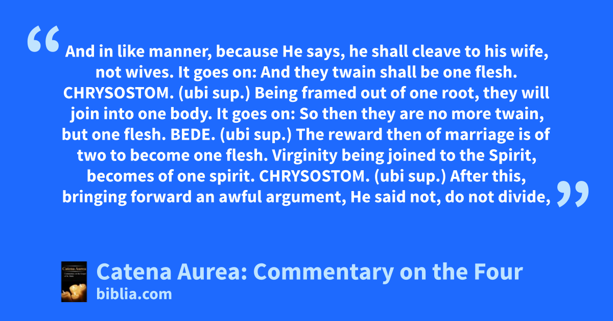 And in like manner, because He says, he shall cleave to his wife, not wives. It goes on: And they twain shall be one flesh. CHRYSOSTOM. (ubi sup.) Being framed out of one root, they will join into one body. It goes on: So then they are no more twain, but one flesh. BEDE. (ubi sup.) The reward then of marriage is of two to become one flesh. Virginity being joined to the Spirit, becomes of one spirit. CHRYSOSTOM. (ubi sup.) After this, bringing forward an awful argument, He said not, do not divide,