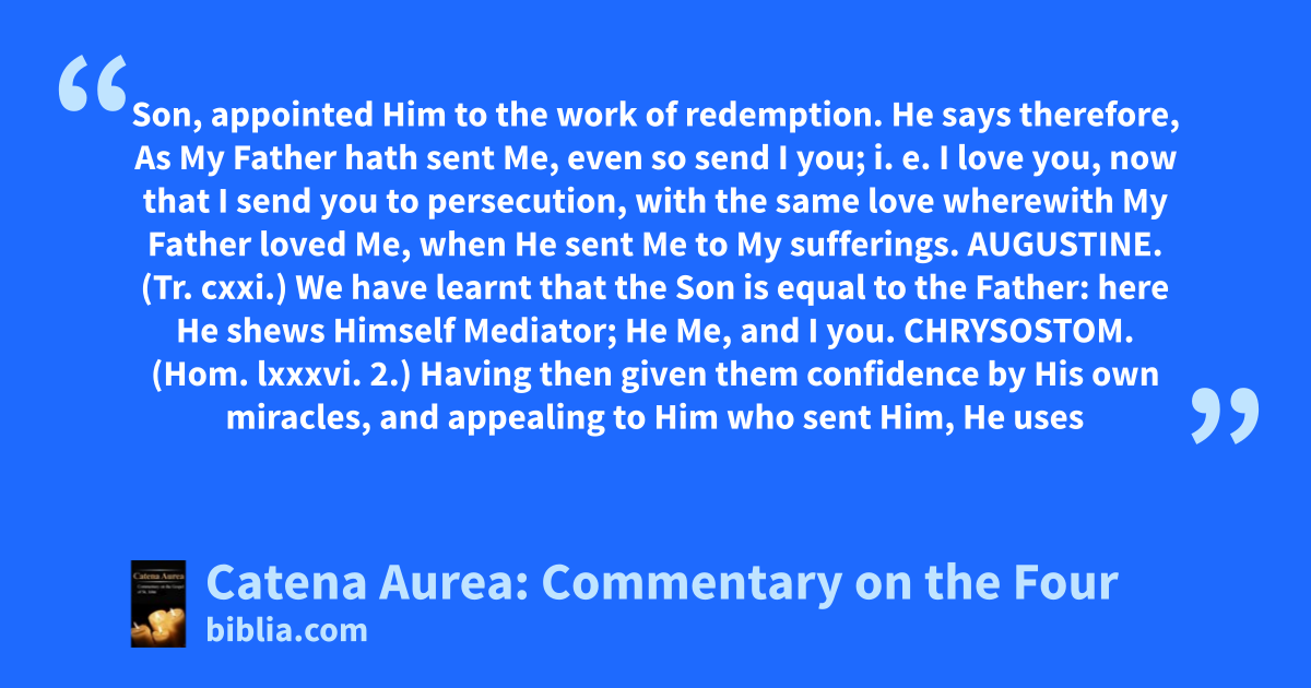 Son, appointed Him to the work of redemption. He says therefore, As My Father hath sent Me, even so send I you; i. e. I love you, now that I send you to persecution, with the same love wherewith My Father loved Me, when He sent Me to My sufferings. AUGUSTINE. (Tr. cxxi.) We have learnt that the Son is equal to the Father: here He shews Himself Mediator; He Me, and I you. CHRYSOSTOM. (Hom. lxxxvi. 2.) Having then given them confidence by His own miracles, and appealing to Him who sent Him, He uses