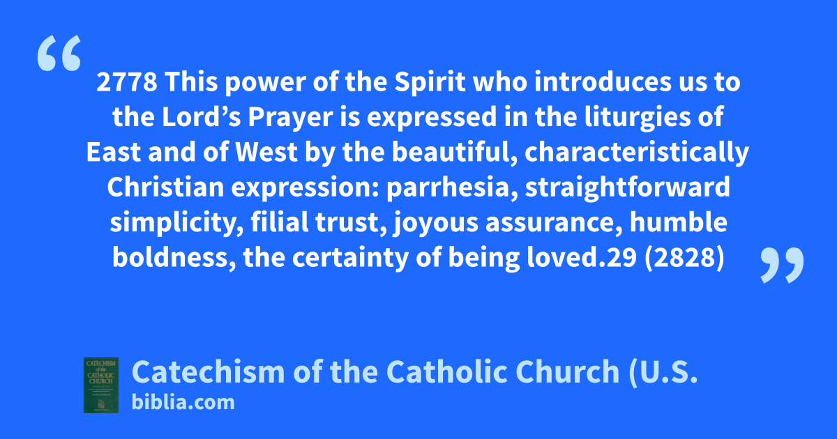 2778 This power of the Spirit who introduces us to the Lord’s Prayer is expressed in the liturgies of East and of West by the beautiful, characteristically Christian expression: parrhesia, straightforward simplicity, filial trust, joyous assurance, humble boldness, the certainty of being loved.29 (2828)