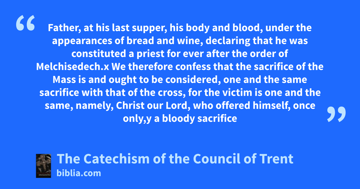 Father, at his last supper, his body and blood, under the appearances of bread and wine, declaring that he was constituted a priest for ever after the order of Melchisedech.x We therefore confess that the sacrifice of the Mass is and ought to be considered, one and the same sacrifice with that of the cross, for the victim is one and the same, namely, Christ our Lord, who offered himself, once only,y a bloody sacrifice