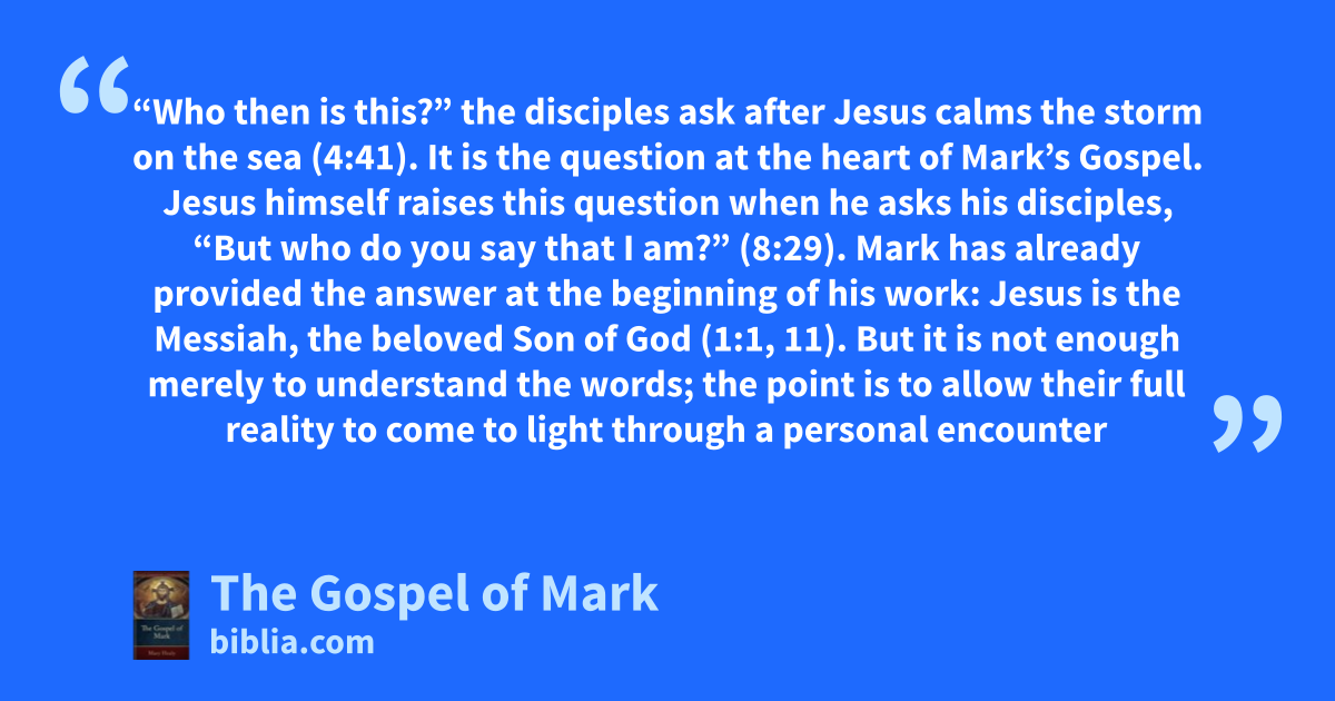 “Who then is this?” the disciples ask after Jesus calms the storm on the sea (4:41). It is the question at the heart of Mark’s Gospel. Jesus himself raises this question when he asks his disciples, “But who do you say that I am?” (8:29). Mark has already provided the answer at the beginning of his work: Jesus is the Messiah, the beloved Son of God (1:1, 11). But it is not enough merely to understand the words; the point is to allow their full reality to come to light through a personal encounter