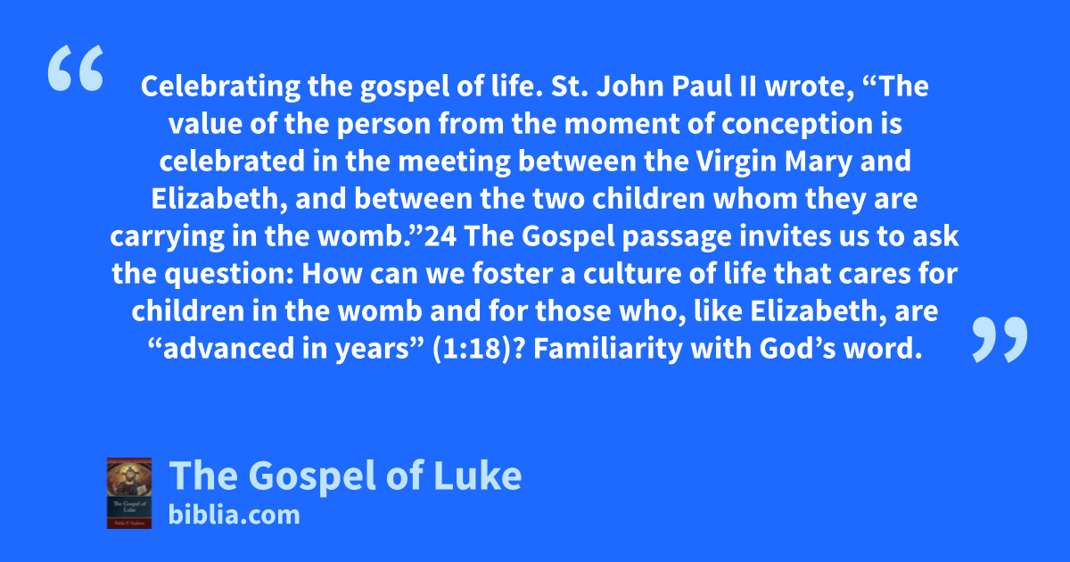 Celebrating the gospel of life. St. John Paul II wrote, “The value of the person from the moment of conception is celebrated in the meeting between the Virgin Mary and Elizabeth, and between the two children whom they are carrying in the womb.”24 The Gospel passage invites us to ask the question: How can we foster a culture of life that cares for children in the womb and for those who, like Elizabeth, are “advanced in years” (1:18)? Familiarity with God’s word.