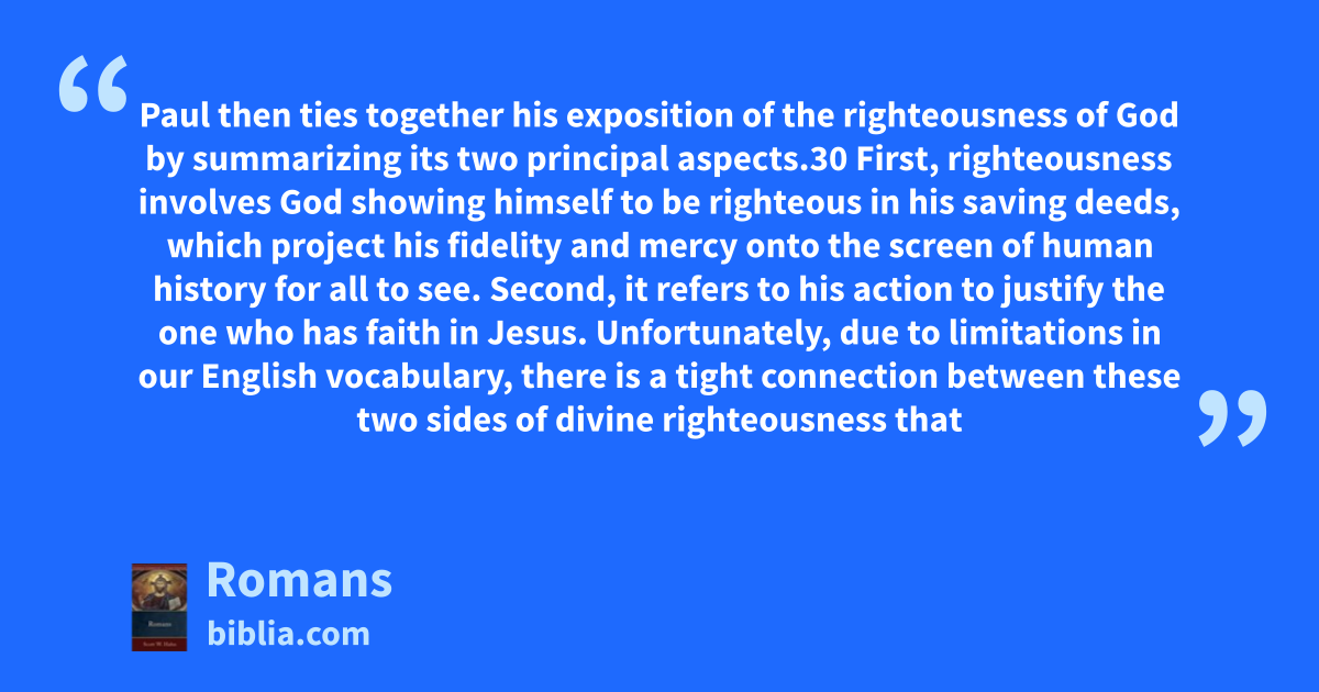 Paul then ties together his exposition of the righteousness of God by summarizing its two principal aspects.30 First, righteousness involves God showing himself to be righteous in his saving deeds, which project his fidelity and mercy onto the screen of human history for all to see. Second, it refers to his action to justify the one who has faith in Jesus. Unfortunately, due to limitations in our English vocabulary, there is a tight connection between these two sides of divine righteousness that