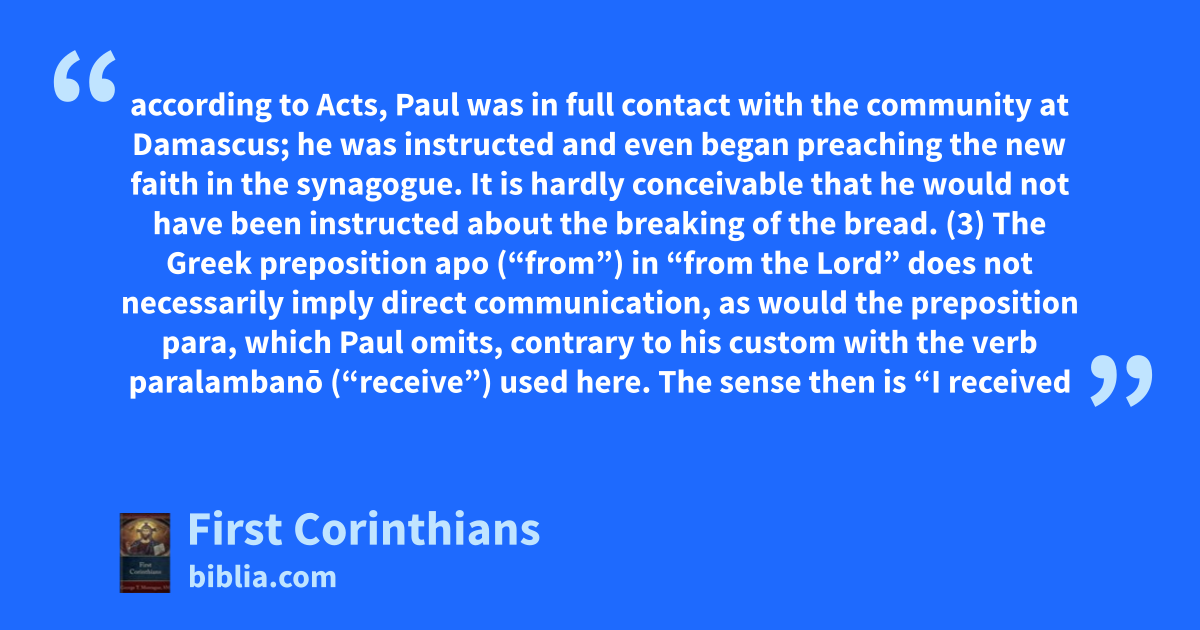 according to Acts, Paul was in full contact with the community at Damascus; he was instructed and even began preaching the new faith in the synagogue. It is hardly conceivable that he would not have been instructed about the breaking of the bread. (3) The Greek preposition apo (“from”) in “from the Lord” does not necessarily imply direct communication, as would the preposition para, which Paul omits, contrary to his custom with the verb paralambanō (“receive”) used here. The sense then is “I received
