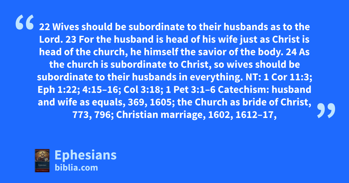 22 Wives should be subordinate to their husbands as to the Lord. 23 For the husband is head of his wife just as Christ is head of the church, he himself the savior of the body. 24 As the church is subordinate to Christ, so wives should be subordinate to their husbands in everything. NT: 1 Cor 11:3; Eph 1:22; 4:15–16; Col 3:18; 1 Pet 3:1–6 Catechism: husband and wife as equals, 369, 1605; the Church as bride of Christ, 773, 796; Christian marriage, 1602, 1612–17,