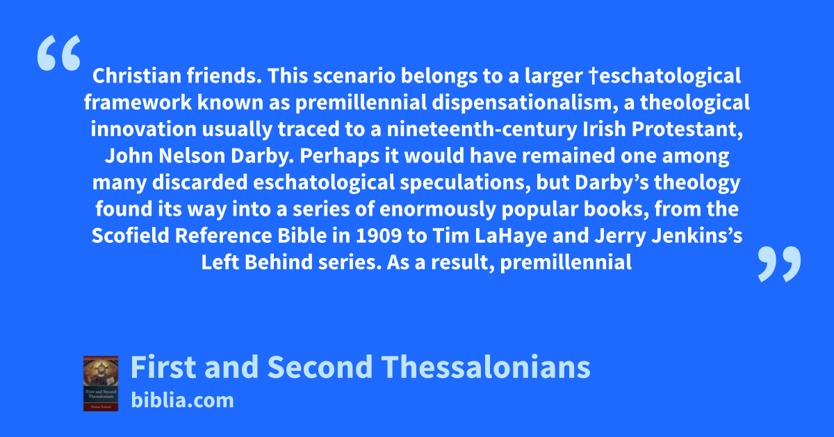 Christian friends. This scenario belongs to a larger †eschatological framework known as premillennial dispensationalism, a theological innovation usually traced to a nineteenth-century Irish Protestant, John Nelson Darby. Perhaps it would have remained one among many discarded eschatological speculations, but Darby’s theology found its way into a series of enormously popular books, from the Scofield Reference Bible in 1909 to Tim LaHaye and Jerry Jenkins’s Left Behind series. As a result, premillennial