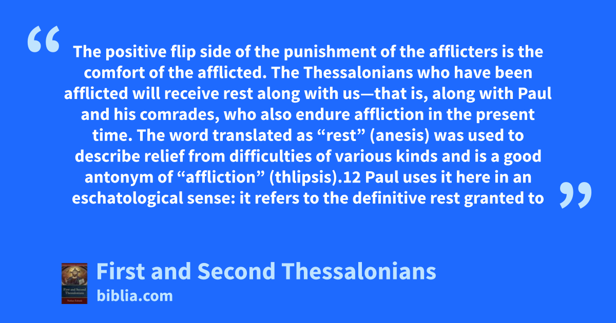 The positive flip side of the punishment of the afflicters is the comfort of the afflicted. The Thessalonians who have been afflicted will receive rest along with us—that is, along with Paul and his comrades, who also endure affliction in the present time. The word translated as “rest” (anesis) was used to describe relief from difficulties of various kinds and is a good antonym of “affliction” (thlipsis).12 Paul uses it here in an eschatological sense: it refers to the definitive rest granted to