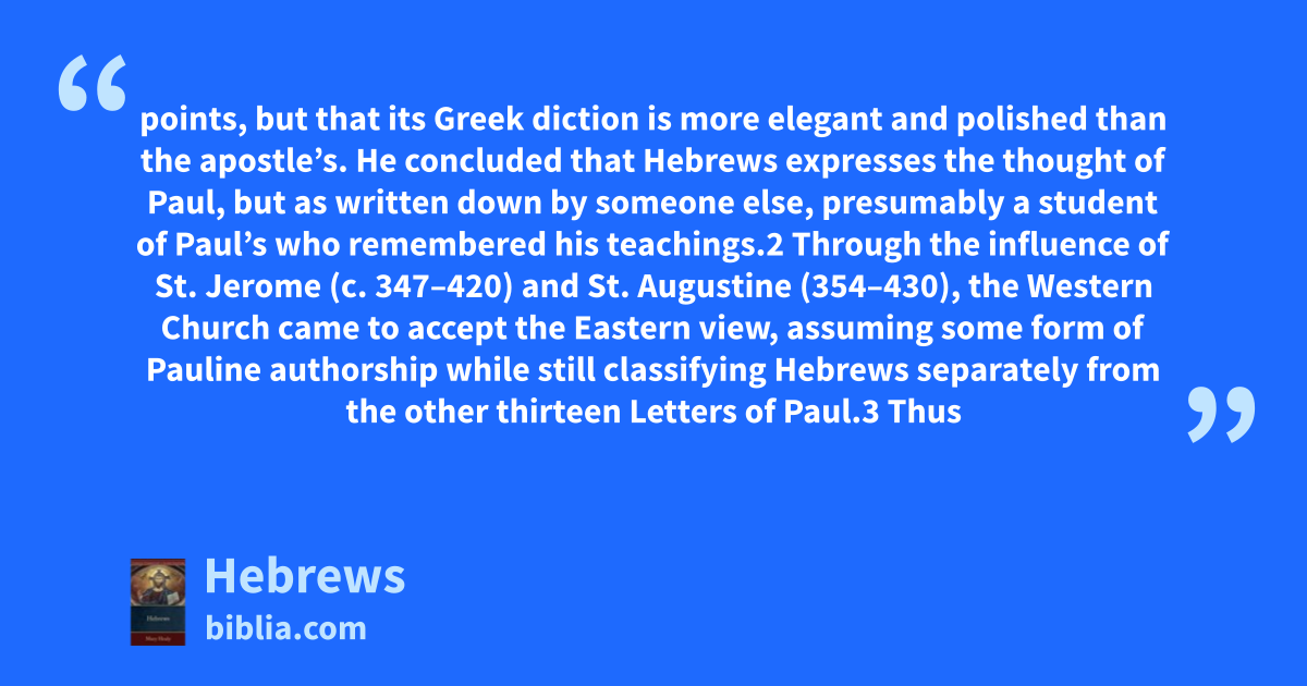 points, but that its Greek diction is more elegant and polished than the apostle’s. He concluded that Hebrews expresses the thought of Paul, but as written down by someone else, presumably a student of Paul’s who remembered his teachings.2 Through the influence of St. Jerome (c. 347–420) and St. Augustine (354–430), the Western Church came to accept the Eastern view, assuming some form of Pauline authorship while still classifying Hebrews separately from the other thirteen Letters of Paul.3 Thus