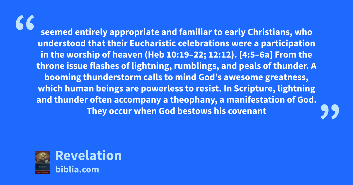 seemed entirely appropriate and familiar to early Christians, who understood that their Eucharistic celebrations were a participation in the worship of heaven (Heb 10:19–22; 12:12). [4:5–6a] From the throne issue flashes of lightning, rumblings, and peals of thunder. A booming thunderstorm calls to mind God’s awesome greatness, which human beings are powerless to resist. In Scripture, lightning and thunder often accompany a theophany, a manifestation of God. They occur when God bestows his covenant