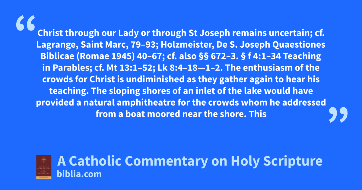 Christ through our Lady or through St Joseph remains uncertain; cf. Lagrange, Saint Marc, 79–93; Holzmeister, De S. Joseph Quaestiones Biblicae (Romae 1945) 40–67; cf. also §§ 672–3. § f 4:1–34 Teaching in Parables; cf. Mt 13:1–52; Lk 8:4–18—1–2. The enthusiasm of the crowds for Christ is undiminished as they gather again to hear his teaching. The sloping shores of an inlet of the lake would have provided a natural amphitheatre for the crowds whom he addressed from a boat moored near the shore. This