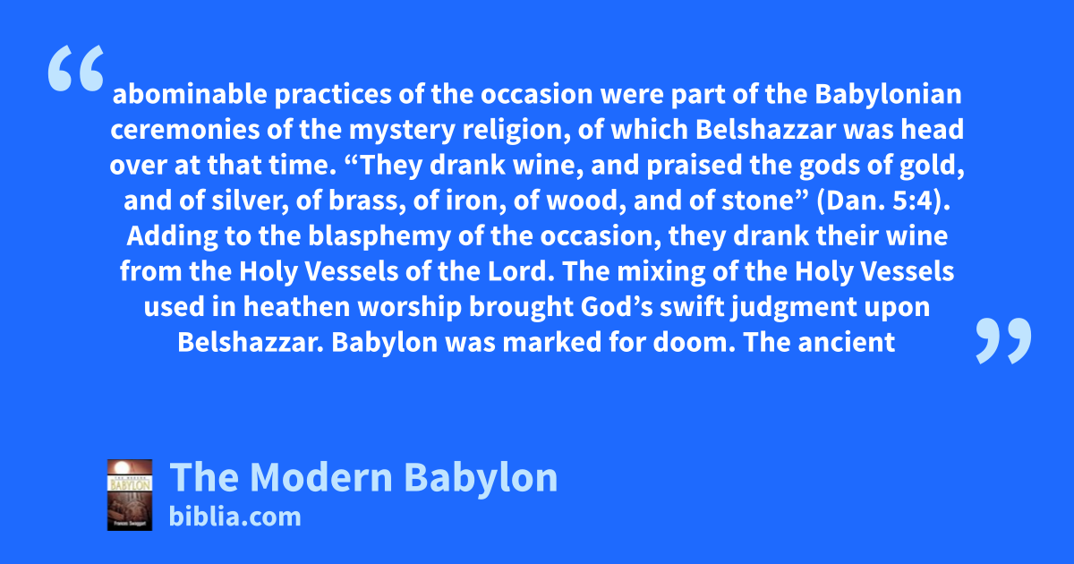 abominable practices of the occasion were part of the Babylonian ceremonies of the mystery religion, of which Belshazzar was head over at that time. “They drank wine, and praised the gods of gold, and of silver, of brass, of iron, of wood, and of stone” (Dan. 5:4). Adding to the blasphemy of the occasion, they drank their wine from the Holy Vessels of the Lord. The mixing of the Holy Vessels used in heathen worship brought God’s swift judgment upon Belshazzar. Babylon was marked for doom. The ancient