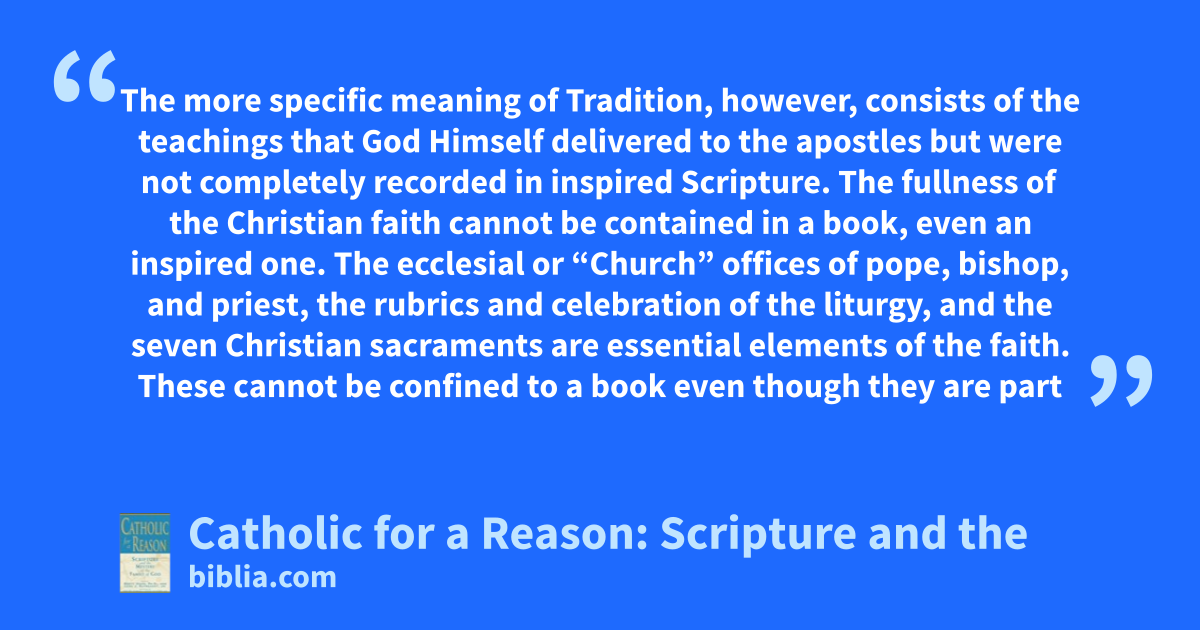 The more specific meaning of Tradition, however, consists of the teachings that God Himself delivered to the apostles but were not completely recorded in inspired Scripture. The fullness of the Christian faith cannot be contained in a book, even an inspired one. The ecclesial or “Church” offices of pope, bishop, and priest, the rubrics and celebration of the liturgy, and the seven Christian sacraments are essential elements of the faith. These cannot be confined to a book even though they are part