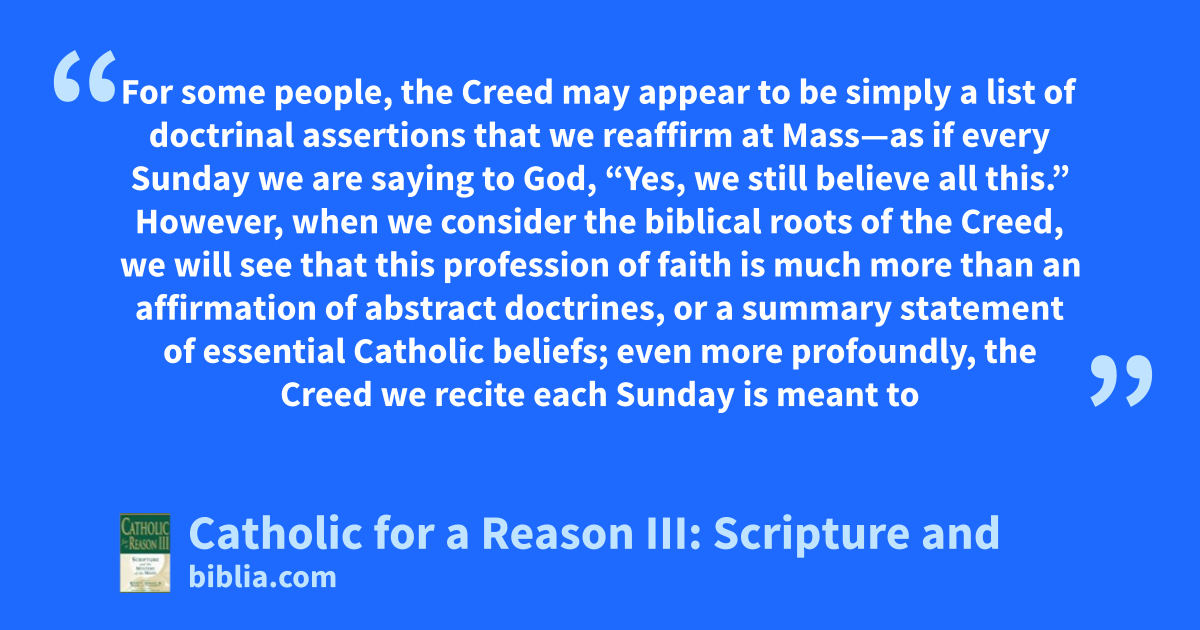 For some people, the Creed may appear to be simply a list of doctrinal assertions that we reaffirm at Mass—as if every Sunday we are saying to God, “Yes, we still believe all this.” However, when we consider the biblical roots of the Creed, we will see that this profession of faith is much more than an affirmation of abstract doctrines, or a summary statement of essential Catholic beliefs; even more profoundly, the Creed we recite each Sunday is meant to