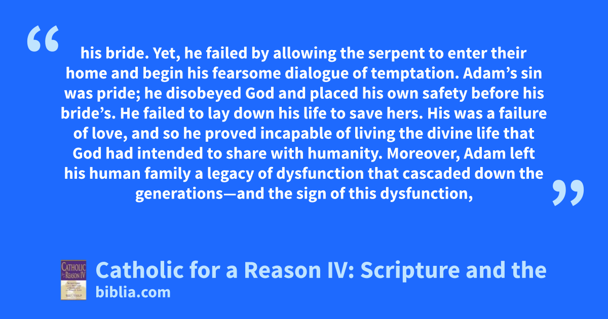 his bride. Yet, he failed by allowing the serpent to enter their home and begin his fearsome dialogue of temptation. Adam’s sin was pride; he disobeyed God and placed his own safety before his bride’s. He failed to lay down his life to save hers. His was a failure of love, and so he proved incapable of living the divine life that God had intended to share with humanity. Moreover, Adam left his human family a legacy of dysfunction that cascaded down the generations—and the sign of this dysfunction,