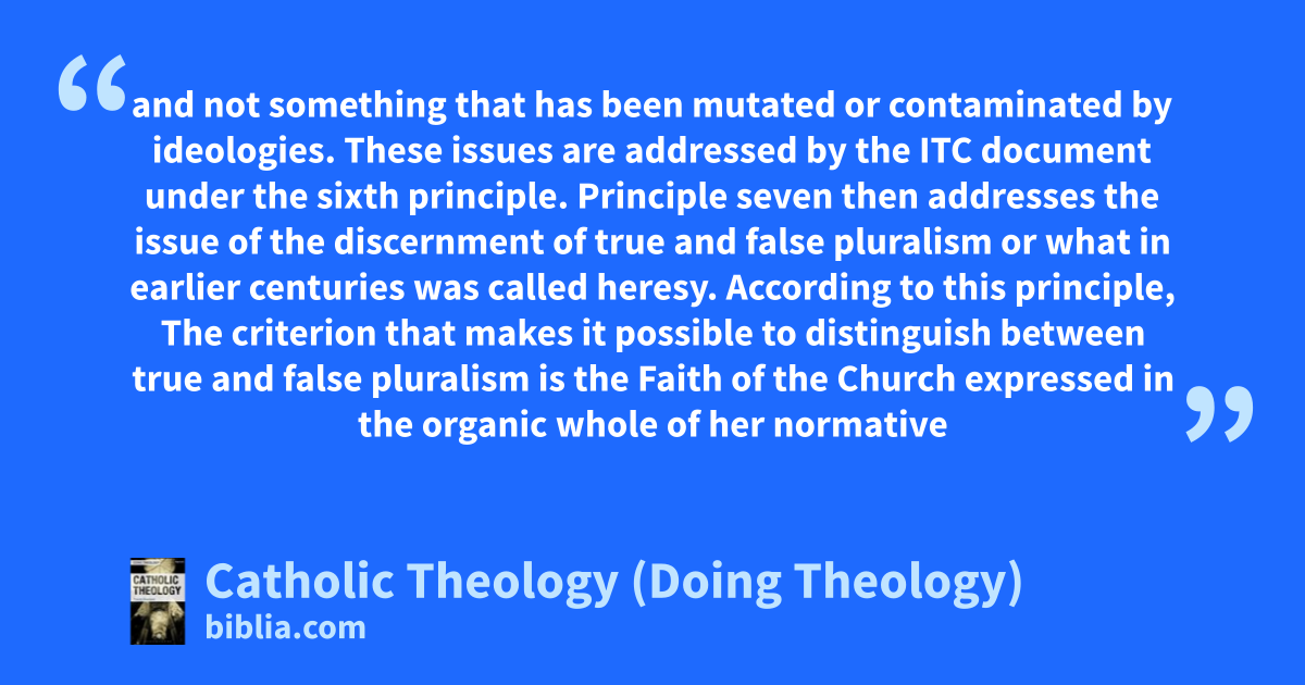 and not something that has been mutated or contaminated by ideologies. These issues are addressed by the ITC document under the sixth principle. Principle seven then addresses the issue of the discernment of true and false pluralism or what in earlier centuries was called heresy. According to this principle, The criterion that makes it possible to distinguish between true and false pluralism is the Faith of the Church expressed in the organic whole of her normative