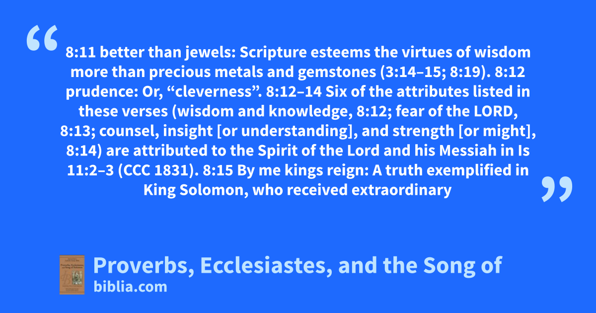 8:11 better than jewels: Scripture esteems the virtues of wisdom more than precious metals and gemstones (3:14–15; 8:19). 8:12 prudence: Or, “cleverness”. 8:12–14 Six of the attributes listed in these verses (wisdom and knowledge, 8:12; fear of the LORD, 8:13; counsel, insight [or understanding], and strength [or might], 8:14) are attributed to the Spirit of the Lord and his Messiah in Is 11:2–3 (CCC 1831). 8:15 By me kings reign: A truth exemplified in King Solomon, who received extraordinary