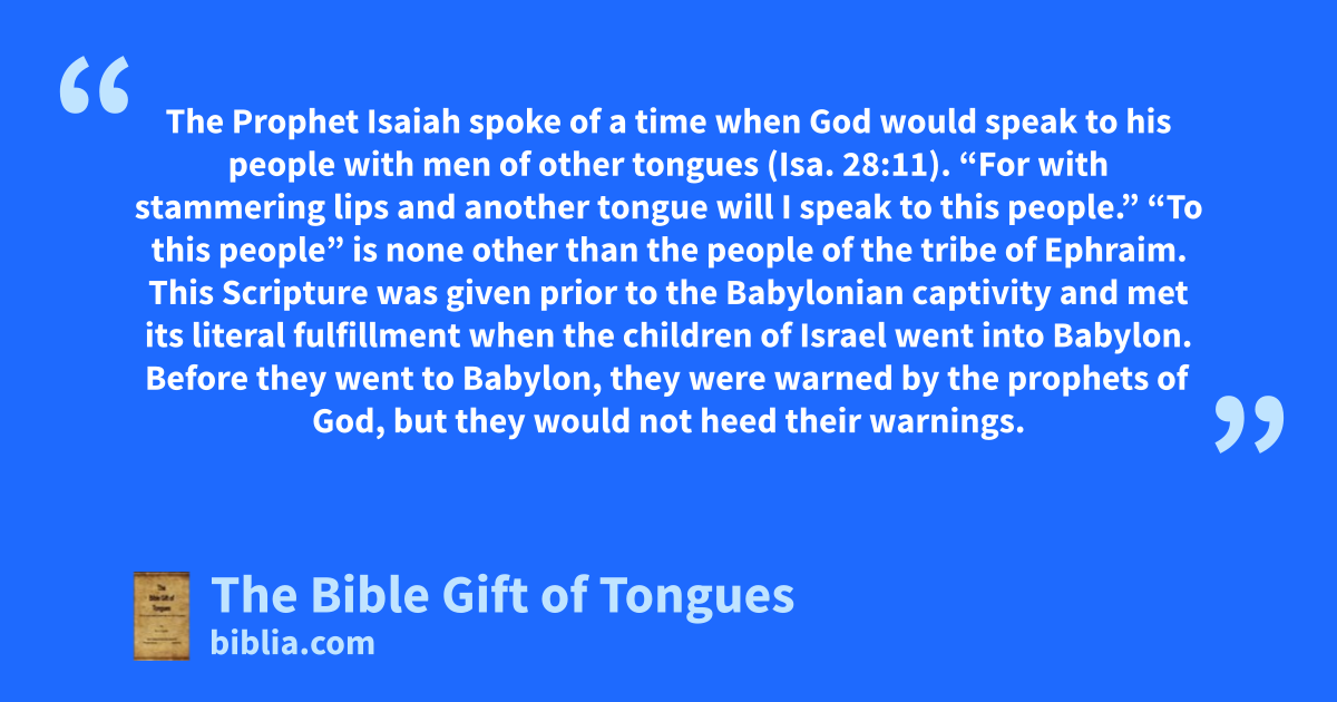 The Prophet Isaiah spoke of a time when God would speak to his people with men of other tongues (Isa. 28:11). “For with stammering lips and another tongue will I speak to this people.” “To this people” is none other than the people of the tribe of Ephraim. This Scripture was given prior to the Babylonian captivity and met its literal fulfillment when the children of Israel went into Babylon. Before they went to Babylon, they were warned by the prophets of God, but they would not heed their warnings.