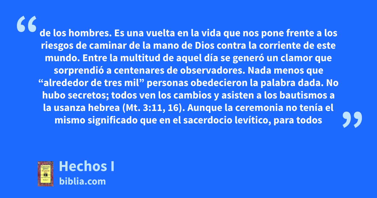 de los hombres. Es una vuelta en la vida que nos pone frente a los riesgos de caminar de la mano de Dios contra la corriente de este mundo. Entre la multitud de aquel día se generó un clamor que sorprendió a centenares de observadores. Nada menos que “alrededor de tres mil” personas obedecieron la palabra dada. No hubo secretos; todos ven los cambios y asisten a los bautismos a la usanza hebrea (Mt. 3:11, 16). Aunque la ceremonia no tenía el mismo significado que en el sacerdocio levítico, para todos