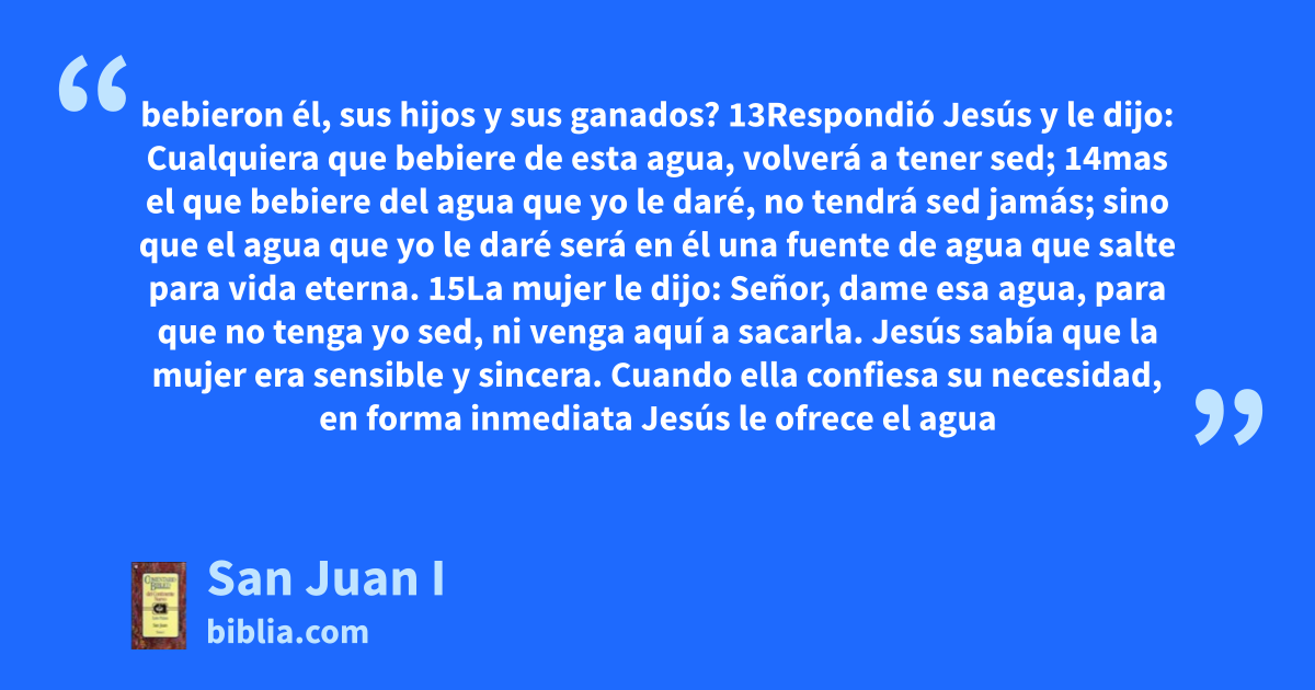 bebieron él, sus hijos y sus ganados? 13Respondió Jesús y le dijo: Cualquiera que bebiere de esta agua, volverá a tener sed; 14mas el que bebiere del agua que yo le daré, no tendrá sed jamás; sino que el agua que yo le daré será en él una fuente de agua que salte para vida eterna. 15La mujer le dijo: Señor, dame esa agua, para que no tenga yo sed, ni venga aquí a sacarla. Jesús sabía que la mujer era sensible y sincera. Cuando ella confiesa su necesidad, en forma inmediata Jesús le ofrece el agua