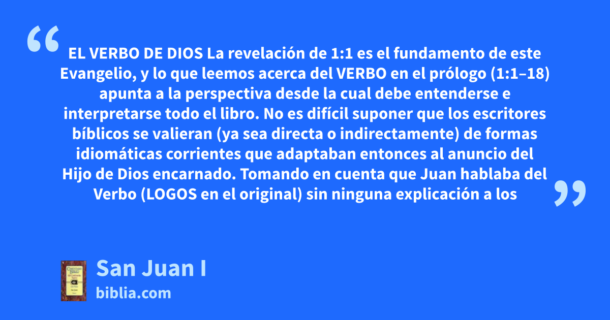 EL VERBO DE DIOS La revelación de 1:1 es el fundamento de este Evangelio, y lo que leemos acerca del VERBO en el prólogo (1:1–18) apunta a la perspectiva desde la cual debe entenderse e interpretarse todo el libro. No es difícil suponer que los escritores bíblicos se valieran (ya sea directa o indirectamente) de formas idiomáticas corrientes que adaptaban entonces al anuncio del Hijo de Dios encarnado. Tomando en cuenta que Juan hablaba del Verbo (LOGOS en el original) sin ninguna explicación a los