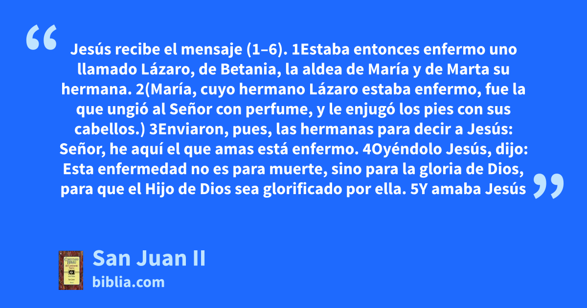 Jesús recibe el mensaje (1–6). 1Estaba entonces enfermo uno llamado Lázaro, de Betania, la aldea de María y de Marta su hermana. 2(María, cuyo hermano Lázaro estaba enfermo, fue la que ungió al Señor con perfume, y le enjugó los pies con sus cabellos.) 3Enviaron, pues, las hermanas para decir a Jesús: Señor, he aquí el que amas está enfermo. 4Oyéndolo Jesús, dijo: Esta enfermedad no es para muerte, sino para la gloria de Dios, para que el Hijo de Dios sea glorificado por ella. 5Y amaba Jesús