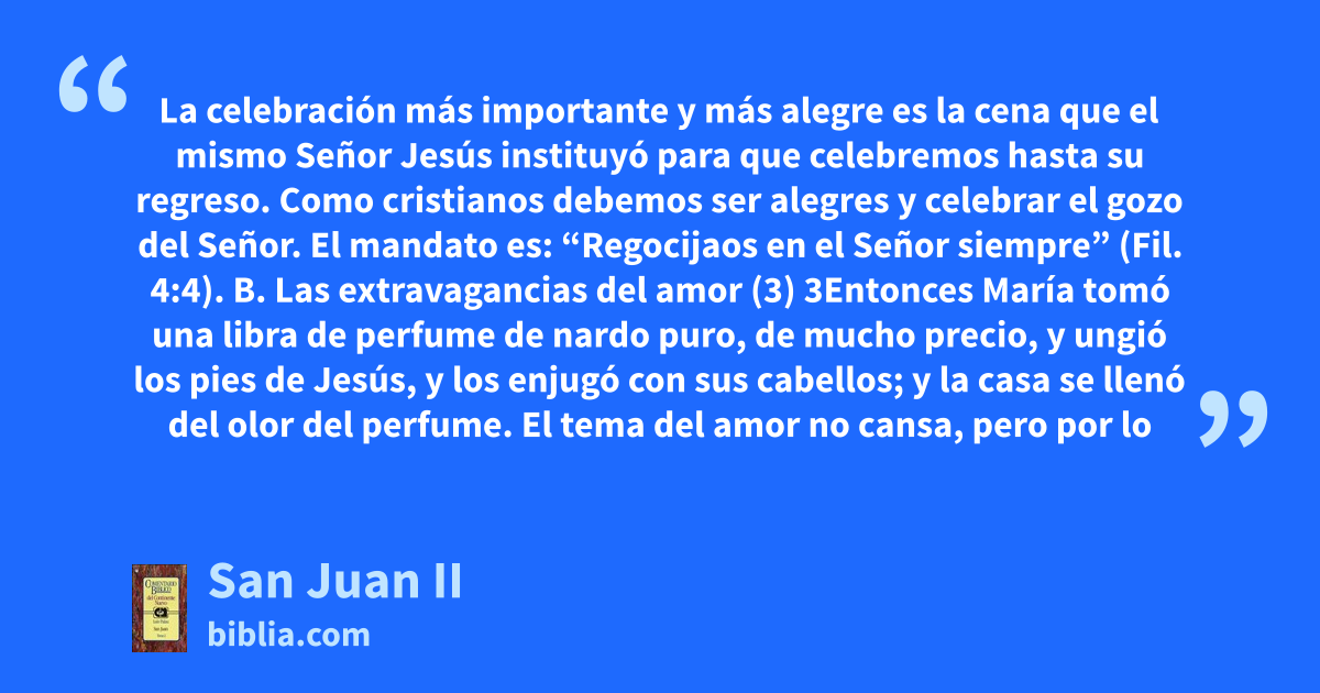 La celebración más importante y más alegre es la cena que el mismo Señor Jesús instituyó para que celebremos hasta su regreso. Como cristianos debemos ser alegres y celebrar el gozo del Señor. El mandato es: “Regocijaos en el Señor siempre” (Fil. 4:4). B. Las extravagancias del amor (3) 3Entonces María tomó una libra de perfume de nardo puro, de mucho precio, y ungió los pies de Jesús, y los enjugó con sus cabellos; y la casa se llenó del olor del perfume. El tema del amor no cansa, pero por lo
