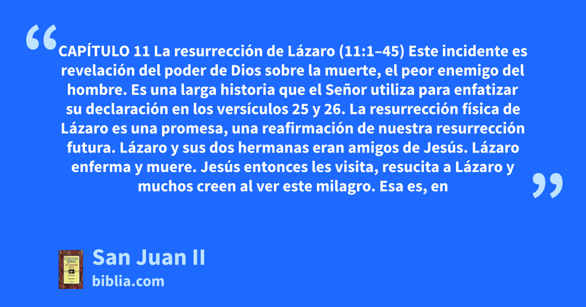 CAPÍTULO 11 La resurrección de Lázaro (11:1–45) Este incidente es revelación del poder de Dios sobre la muerte, el peor enemigo del hombre. Es una larga historia que el Señor utiliza para enfatizar su declaración en los versículos 25 y 26. La resurrección física de Lázaro es una promesa, una reafirmación de nuestra resurrección futura. Lázaro y sus dos hermanas eran amigos de Jesús. Lázaro enferma y muere. Jesús entonces les visita, resucita a Lázaro y muchos creen al ver este milagro. Esa es, en