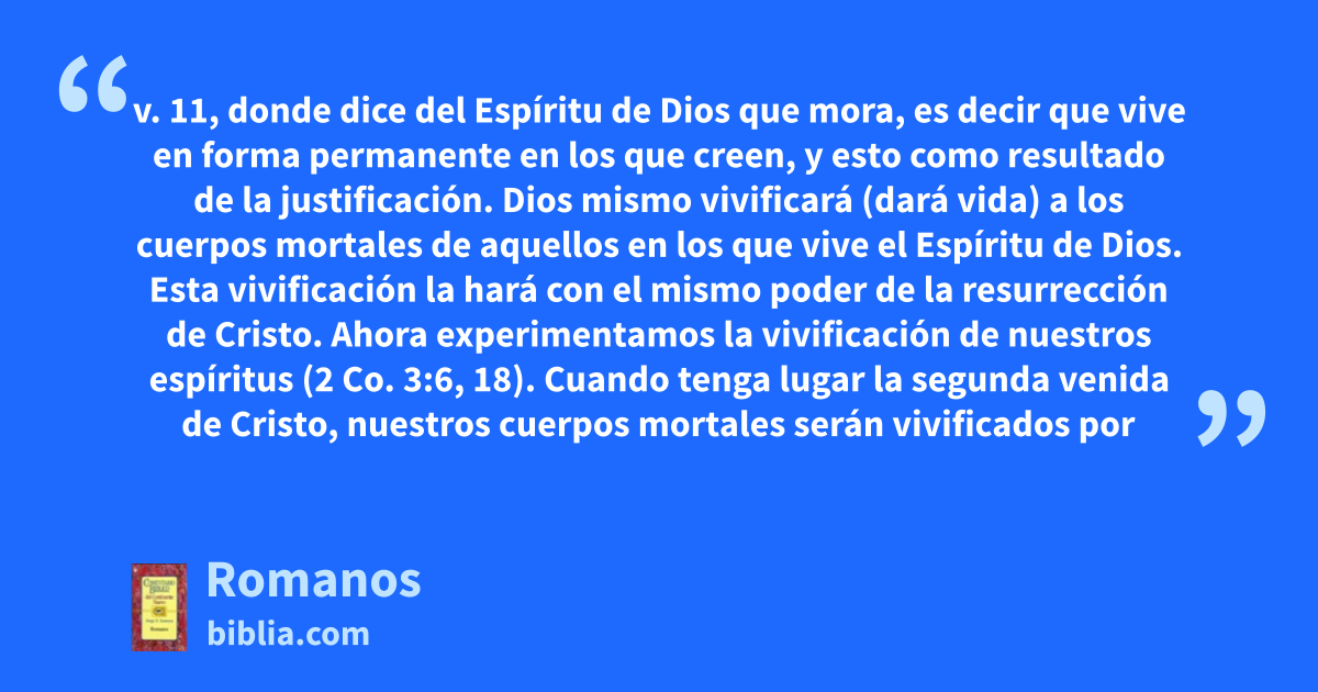 v. 11, donde dice del Espíritu de Dios que mora, es decir que vive en forma permanente en los que creen, y esto como resultado de la justificación. Dios mismo vivificará (dará vida) a los cuerpos mortales de aquellos en los que vive el Espíritu de Dios. Esta vivificación la hará con el mismo poder de la resurrección de Cristo. Ahora experimentamos la vivificación de nuestros espíritus (2 Co. 3:6, 18). Cuando tenga lugar la segunda venida de Cristo, nuestros cuerpos mortales serán vivificados por