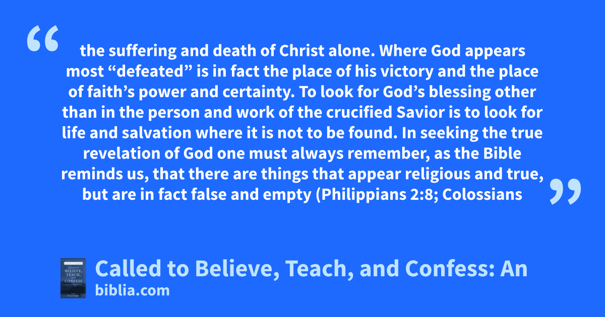 the suffering and death of Christ alone. Where God appears most “defeated” is in fact the place of his victory and the place of faith’s power and certainty. To look for God’s blessing other than in the person and work of the crucified Savior is to look for life and salvation where it is not to be found. In seeking the true revelation of God one must always remember, as the Bible reminds us, that there are things that appear religious and true, but are in fact false and empty (Philippians 2:8; Colossians