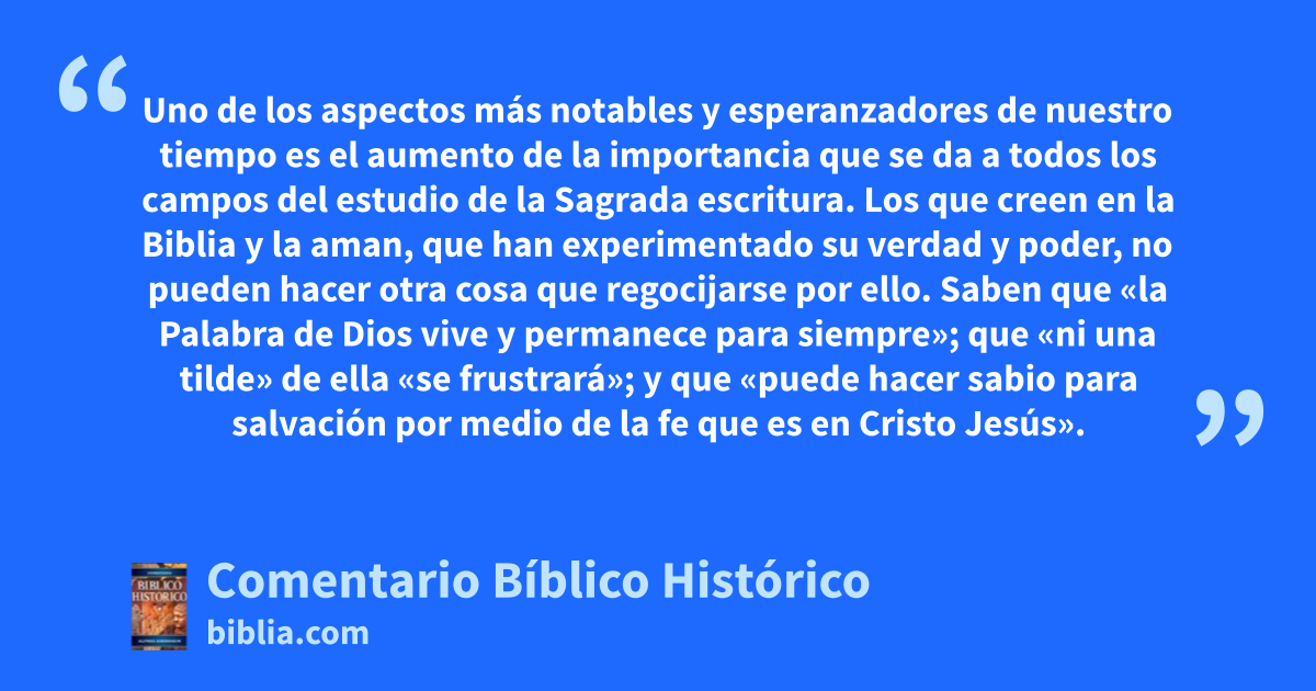 Uno de los aspectos más notables y esperanzadores de nuestro tiempo es el aumento de la importancia que se da a todos los campos del estudio de la Sagrada escritura. Los que creen en la Biblia y la aman, que han experimentado su verdad y poder, no pueden hacer otra cosa que regocijarse por ello. Saben que «la Palabra de Dios vive y permanece para siempre»; que «ni una tilde» de ella «se frustrará»; y que «puede hacer sabio para salvación por medio de la fe que es en Cristo Jesús».