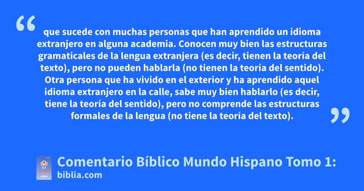 que sucede con muchas personas que han aprendido un idioma extranjero en alguna academia. Conocen muy bien las estructuras gramaticales de la lengua extranjera (es decir, tienen la teoría del texto), pero no pueden hablarla (no tienen la teoría del sentido). Otra persona que ha vivido en el exterior y ha aprendido aquel idioma extranjero en la calle, sabe muy bien hablarlo (es decir, tiene la teoría del sentido), pero no comprende las estructuras formales de la lengua (no tiene la teoría del texto).