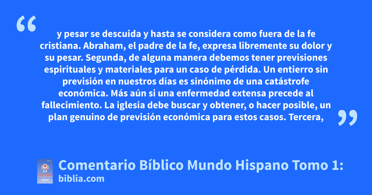 y pesar se descuida y hasta se considera como fuera de la fe cristiana. Abraham, el padre de la fe, expresa libremente su dolor y su pesar. Segunda, de alguna manera debemos tener previsiones espirituales y materiales para un caso de pérdida. Un entierro sin previsión en nuestros días es sinónimo de una catástrofe económica. Más aún si una enfermedad extensa precede al fallecimiento. La iglesia debe buscar y obtener, o hacer posible, un plan genuino de previsión económica para estos casos. Tercera,